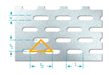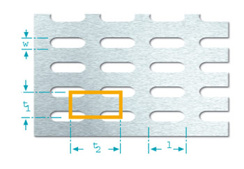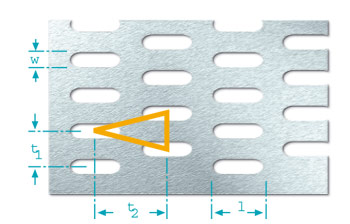 Slots with rounded ends represent the standard version. They are also available in staggered rows (Lv) or straight rows (Lg). Whenever slots are specified it is important to indicate the edge of the sheet with which the long axis of the slots is to be parallel. Slot perforations are used in sieve plates and where the visual impression is important.
